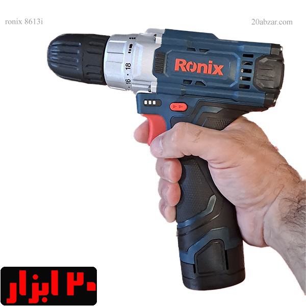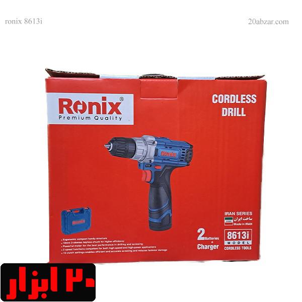 دریل شارژی رونیکس با کد ۸۶۱۳i دارای ۳ نظام اتوماتیک دو تکه و ۱۰ میلیمتری است و خود دریل نیز با وزن یک کیلوگرم سبک و خوش دست است که با ترکیب پلاستیک و لاستیک محافظ در بدنه در برابر ضربات محافظت می شود و همگی درون یک کیف ضد ضربه و محکم ارائه می شوند. چراغ LED نیز برای کار کردن در محیطهای تاریک قرار داده شده است که زمانی که دریل کار می کند و مانعی نیز جلوی آن قرار دارد سنسور فعال و چراغ روشن می شود
